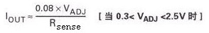 調(diào)節(jié)針可通過(guò)外置的直流電壓(VADJ)進(jìn)行過(guò)驅(qū)動(dòng),以獲得超過(guò)內(nèi)置的電壓基準(zhǔn),并調(diào)整輸出電流使其超出或低于額定值。此時(shí)的額定輸出電流為: